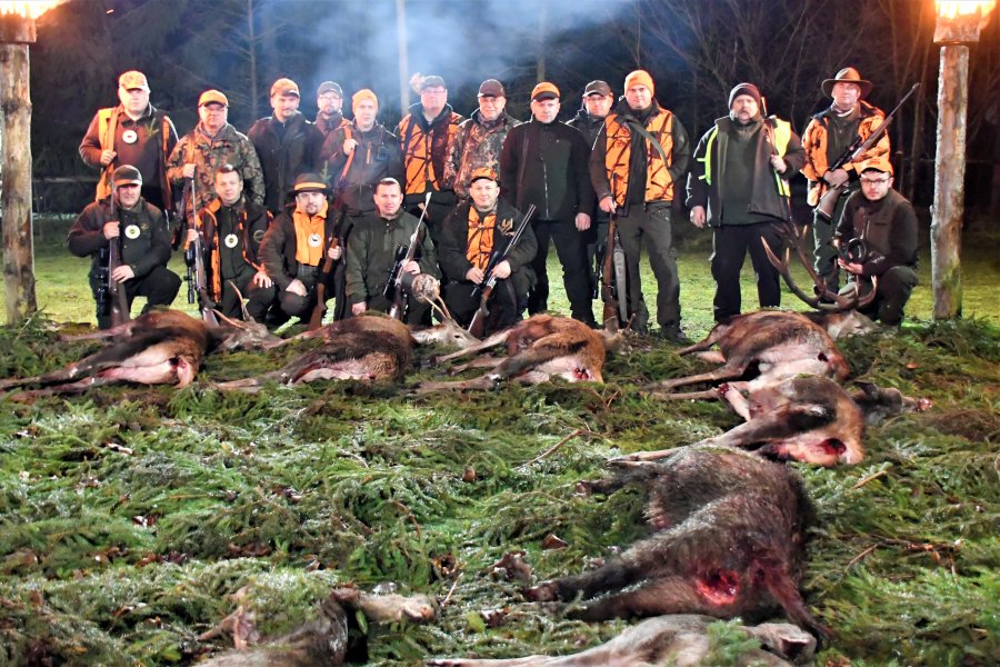 Już w pierwszym miocie nasz gość Waldek Możdżeń – ustrzelił jelenia byka o niespotykanie ładnym wieńcu. W następnych pędzeniach padło kilkanaście strzałów do dzików – lecz na karawanie widniał jedynie jeden wicinek. W ostatnim pędzeniu zamknęliśmy pokaźną chmarę jeleni, z której udało się pozyskać 3 jelenie byki, jelenia łanię i cielę jelenia.
