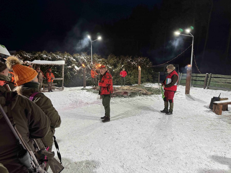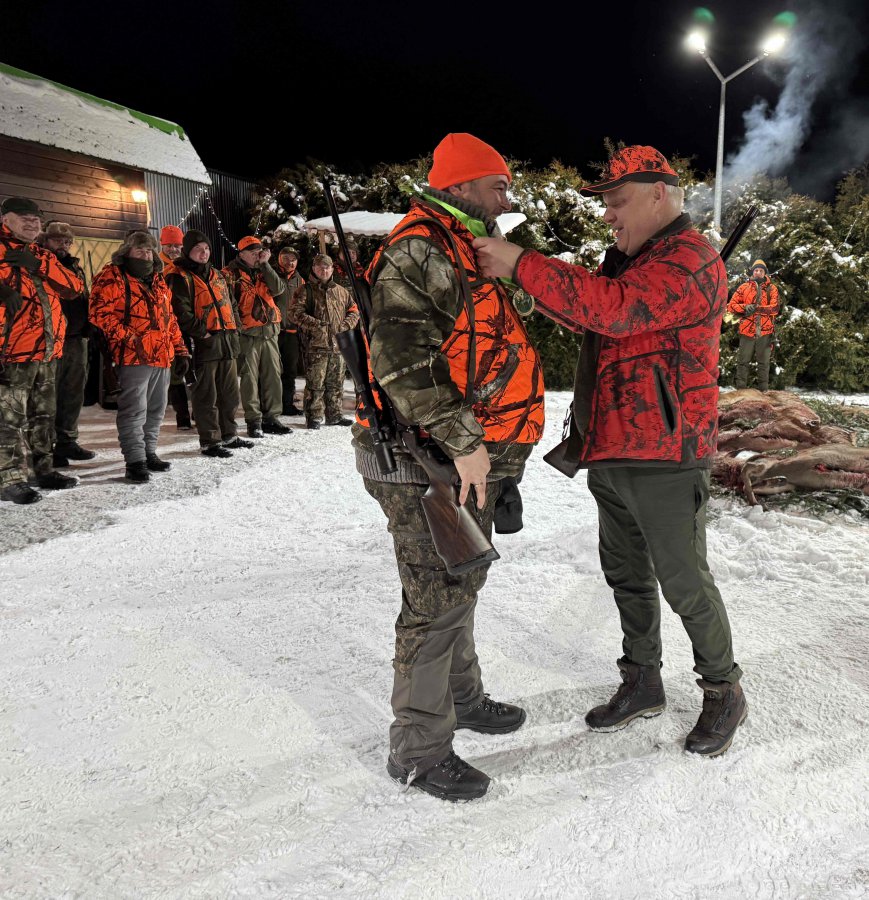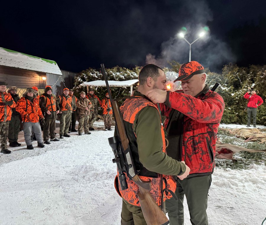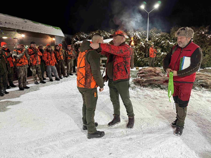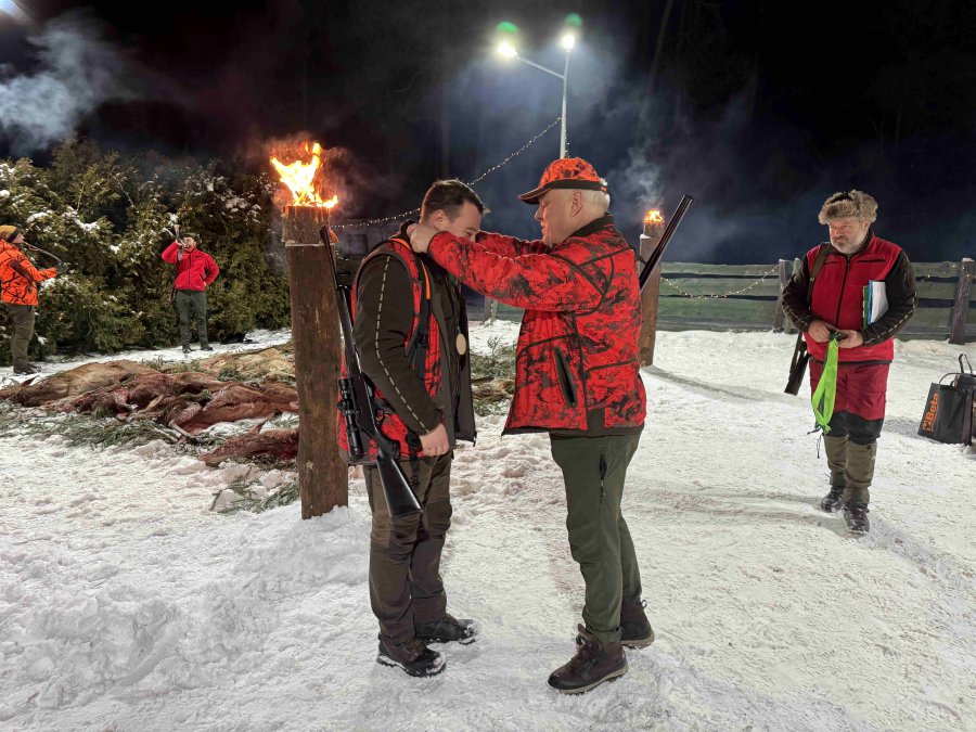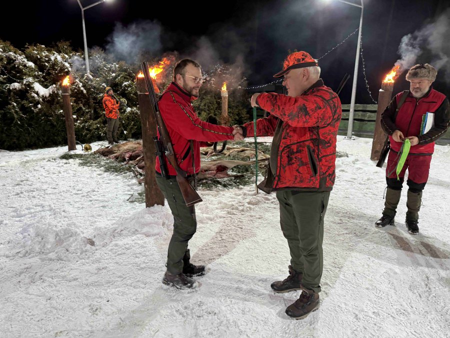 Pierwszą łanię jelenia strzelił Kol. Grzesiu Piechowski - więc zgodnie z zasadami etyki łowieckiej Prezes Koła Kol. Jarosław Strzelecki przeprowadził pasowanie myśliwskie.
