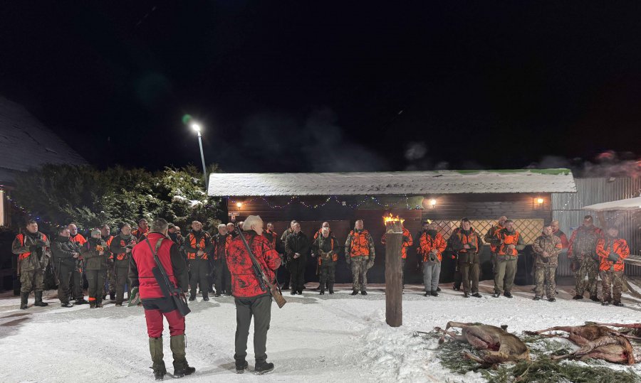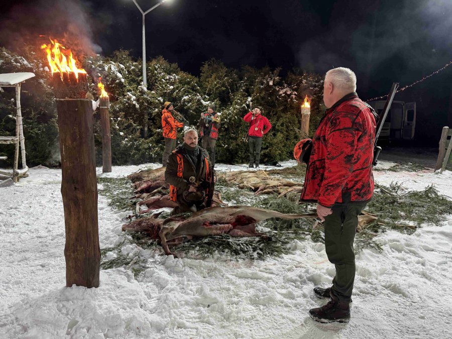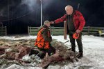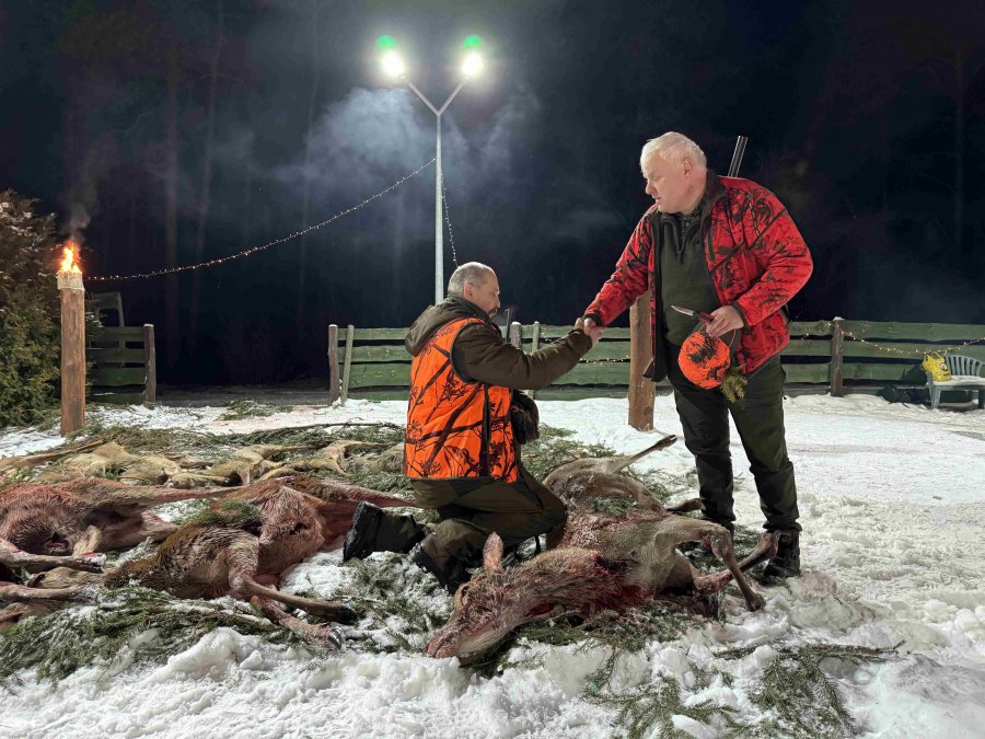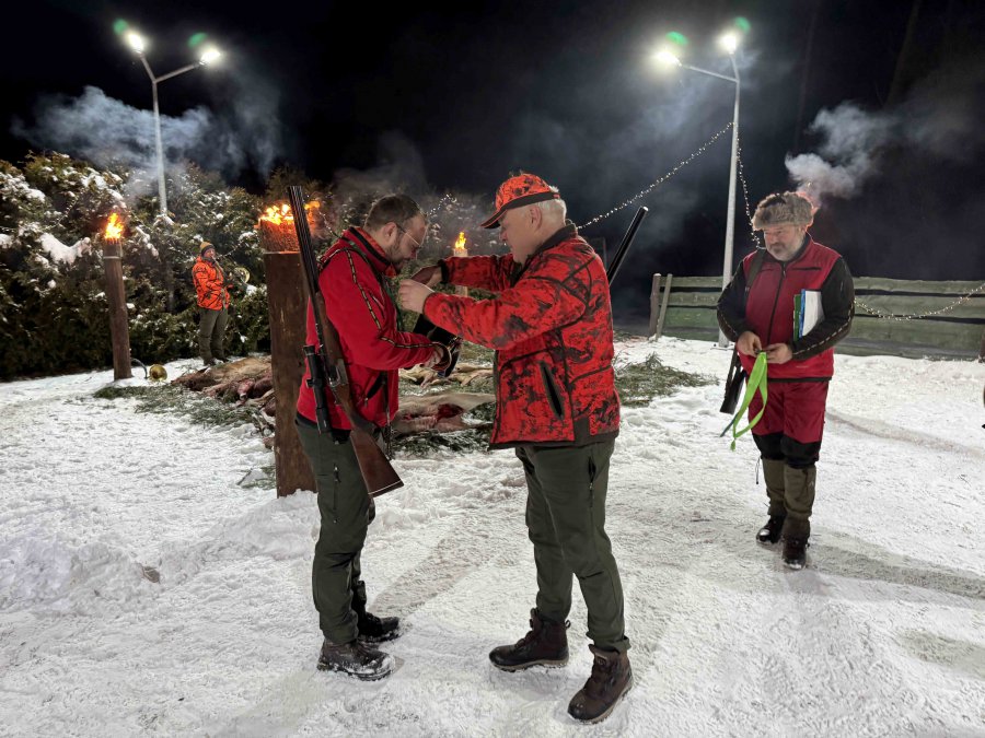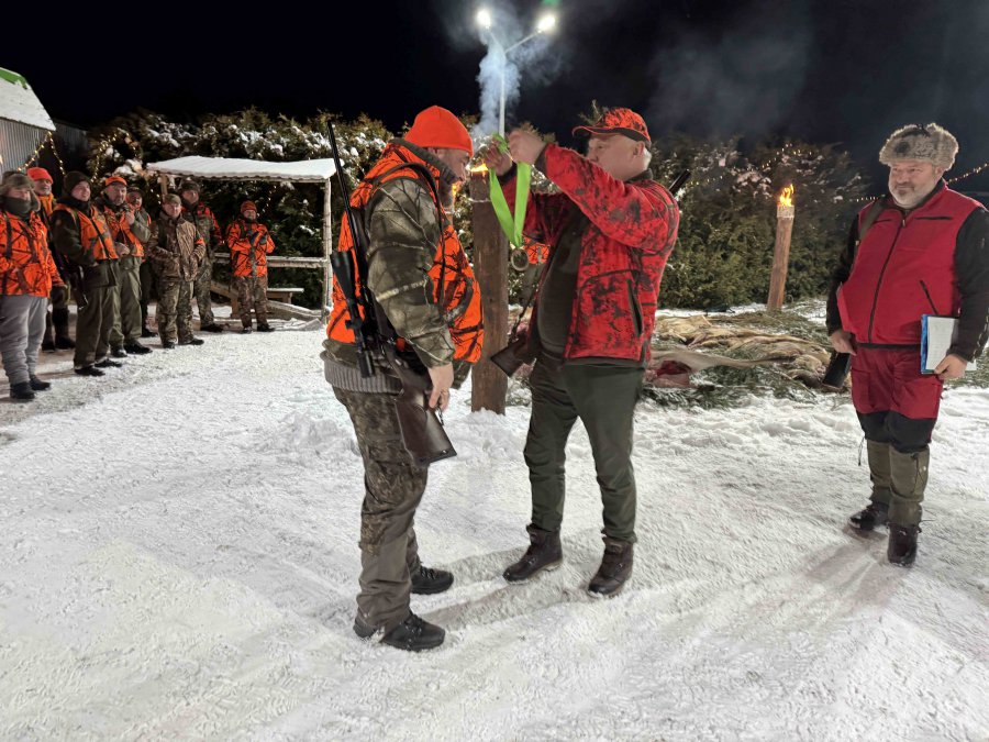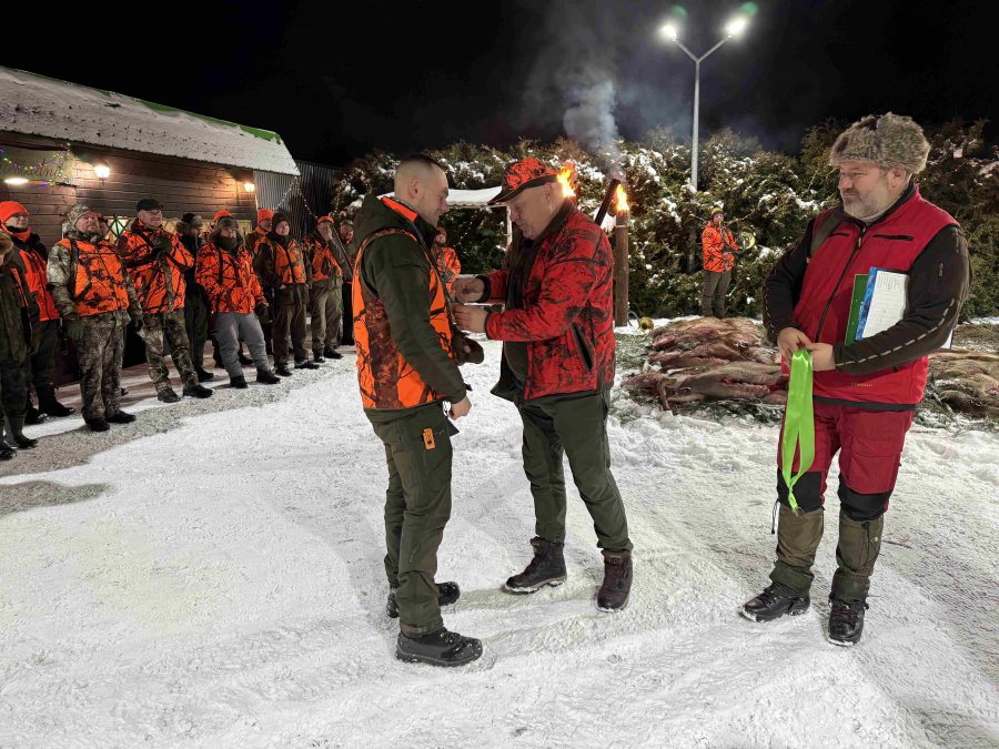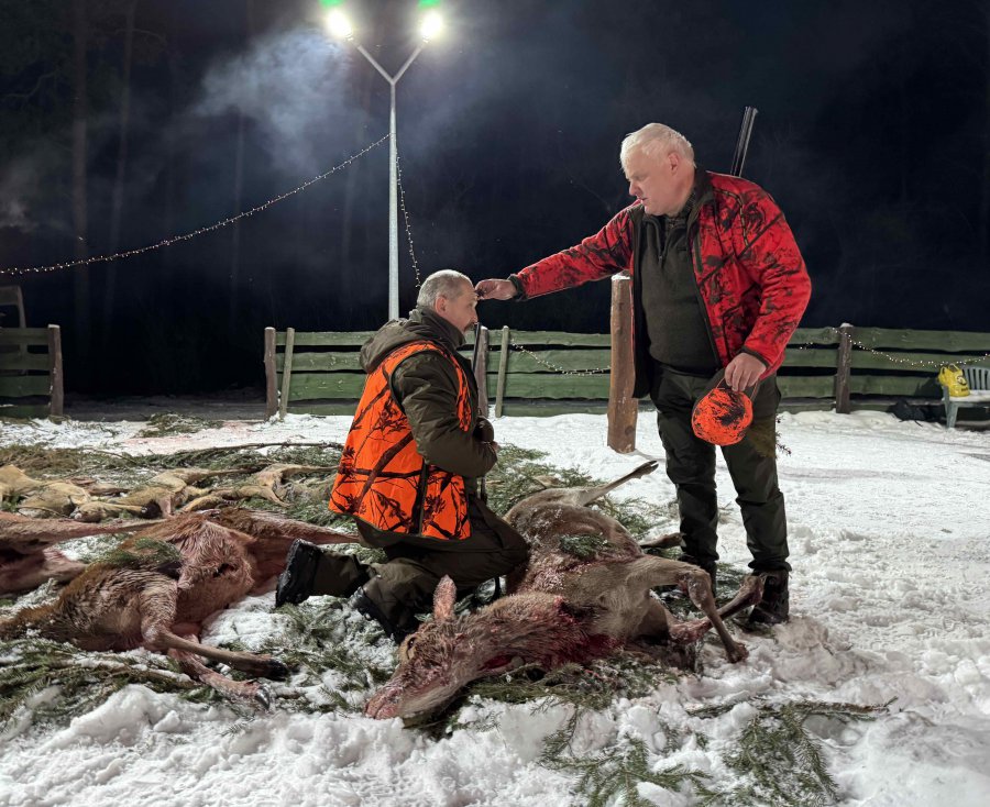 Pierwszą łanię jelenia strzelił Kol. Grzesiu Piechowski - więc zgodnie z zasadami etyki łowieckiej Prezes Koła Kol. Jarosław Strzelecki przeprowadził pasowanie myśliwskie.